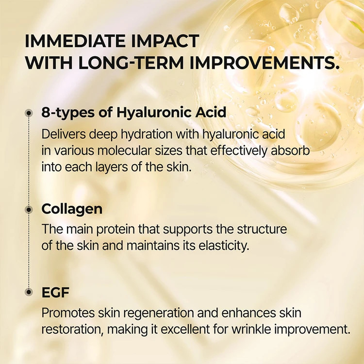 - کمپلکس 8 نوع هیالورونیک اسید: ترکیبی از چندین شکل هیالورونیک اسید (از جمله Sodium Hyaluronate، Hydrolyzed Hyaluronic Acid، Potassium Hyaluronate و دیگر مشتقات) که در لایه های مختلف پوست نفوذ کرده و رطوبتی عمیق و ماندگار ایجاد میکنند. این ترکیب باعث لطافت، حجم دهی و کاهش خشکی ناحیه چشم میشود.